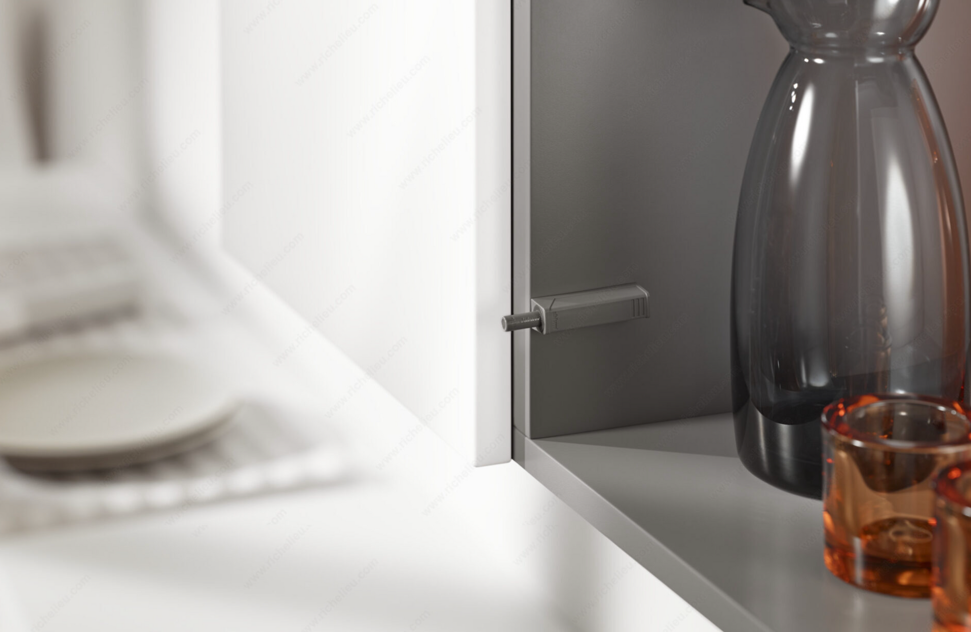 Grâce au nouveau mécanisme d'éjection avec positions de verrouillage, la façade intégrée se règle facilement et sans outil. TIP-ON s'harmonise parfaitement avec l'intérieur du meuble. Sa large gamme de couleurs offre de nombreuses possibilités d'aménagement et s'intègre parfaitement à l'intérieur du meuble.