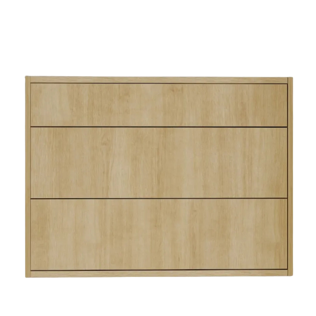 Meuble-lavabo de style moderne. Boîtier en mélamine de 5/8 po. Prêt à installer. Façades de tiroirs en mélamine au fini grain de bois. Boîtier latéral en métal avec glissières de tiroir à fermeture en douceur.