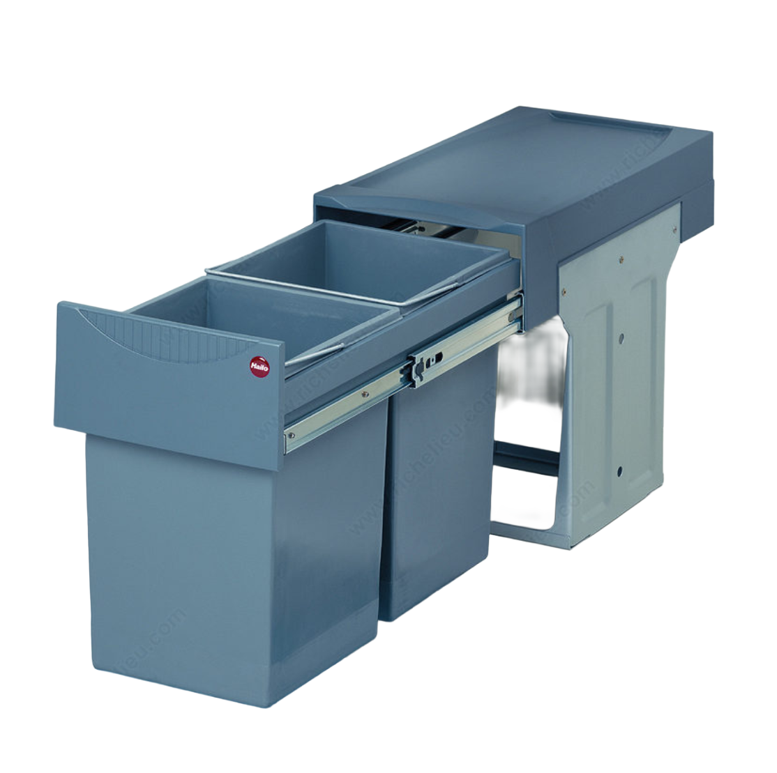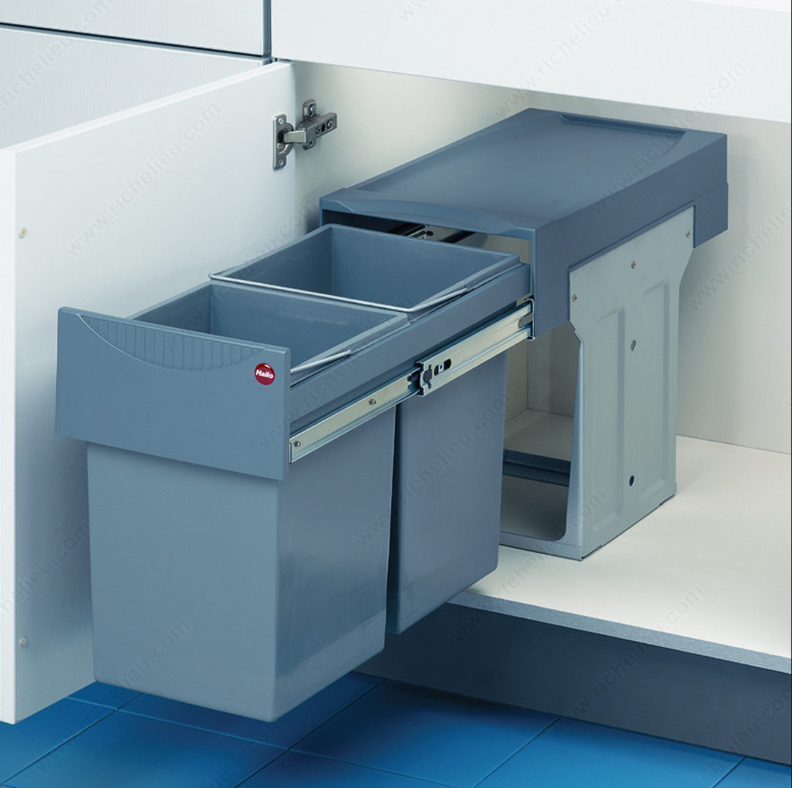 TANDEM est une poubelle double noire à installation par le bas, conçue pour les armoires sous évier à portes battantes.