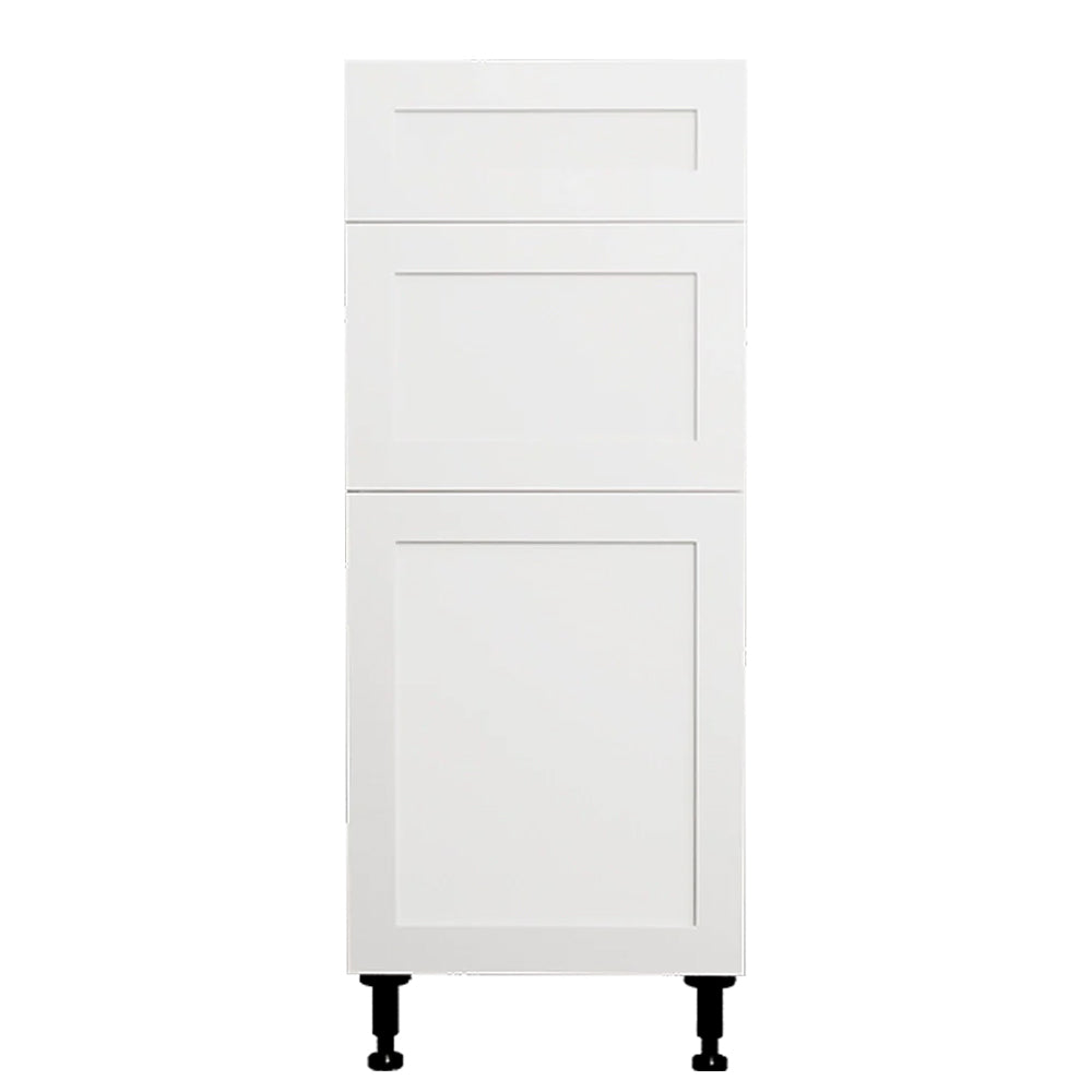 Armoire de cuisine de style shaker. Boîtier en mélamine blanche de 5/8 po. Unité préassemblée et prête à installer. Façades de tiroirs en polymère au fini blanc lisse. Boîtier latéral en métal avec glissières de tiroir à fermeture en douceur.