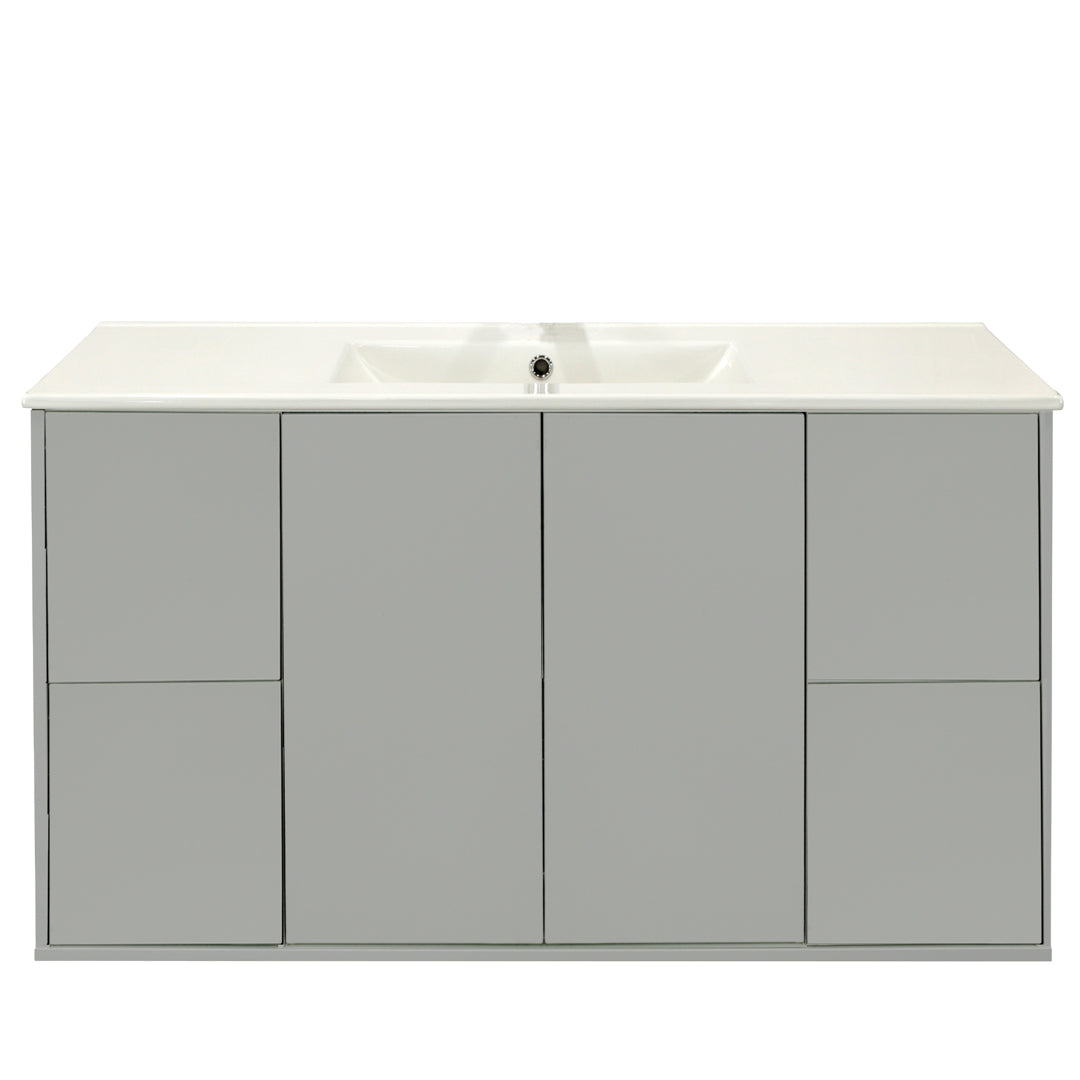 Meuble-lavabo sur pied de style gris . Carcasse en mélamine de 16 mm (5/8 po). Prêt à installer. Façades de tiroirs en polymère finition gris. Caisson latéral en métal avec glissières à fermeture amortie. Charnières à fermeture amortie.
