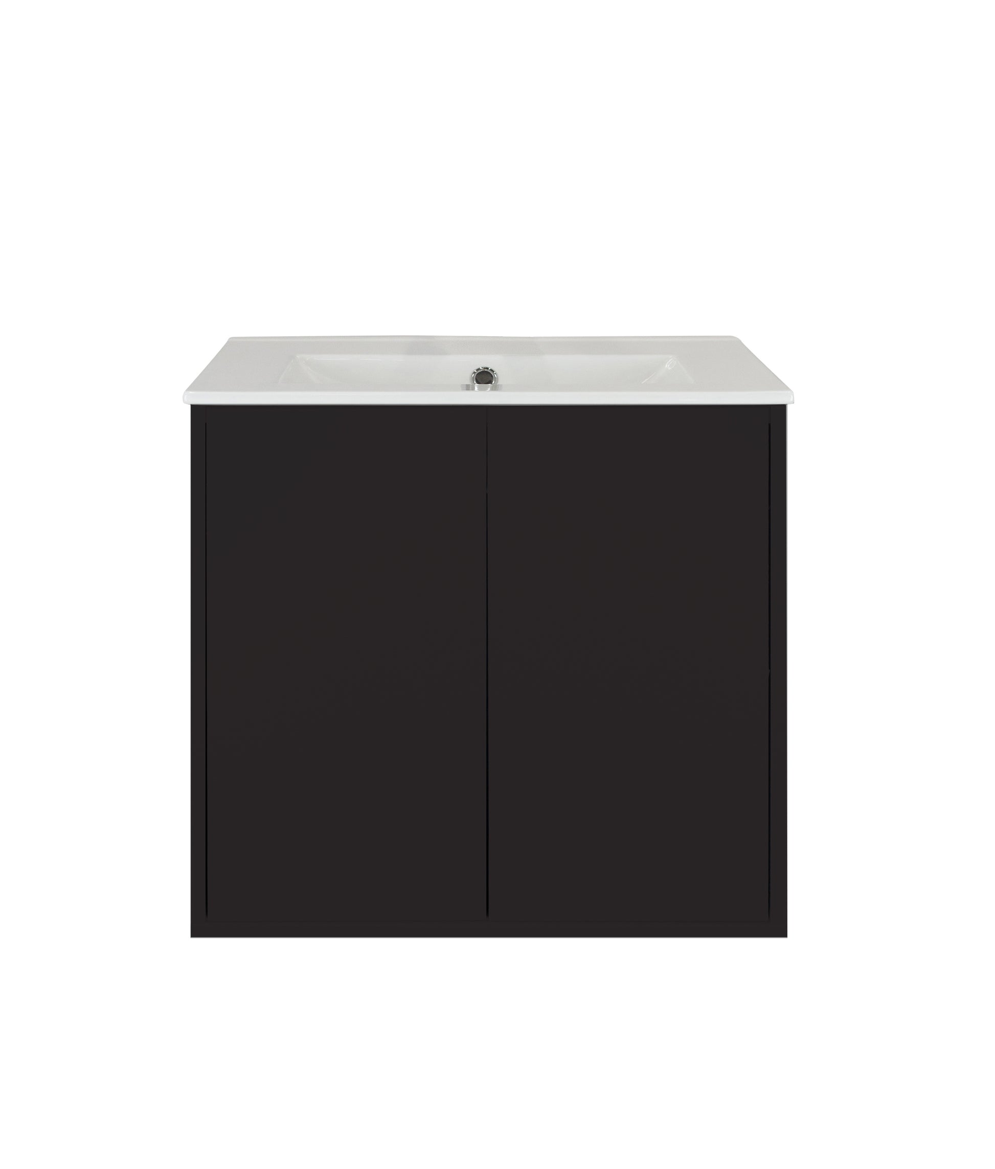 Meuble-lavabo sur pied de . Carcasse en mélamine de 5/8 po. Prêt à installer. Portes en polymère au fini Noir. Carcasse latérale en métal avec glissières à fermeture amortie.